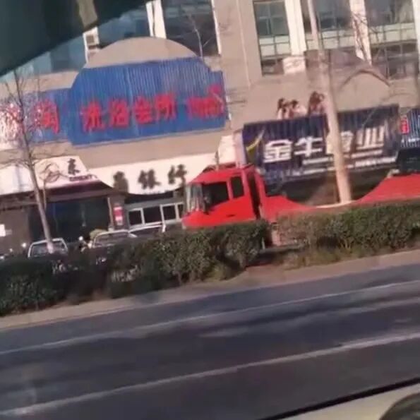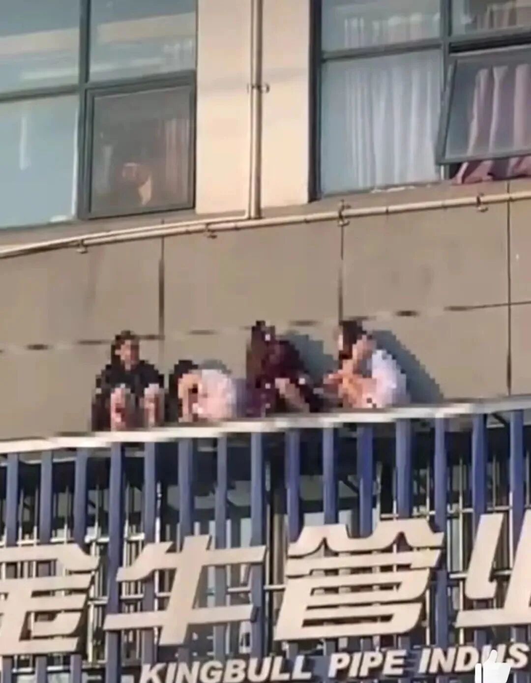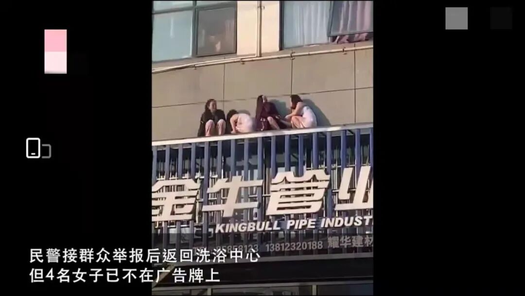 在距该洗浴中心右侧80米处左右的金牛管业店铺广告牌上,有4名美女此刻正蜷缩的蹲在上面。