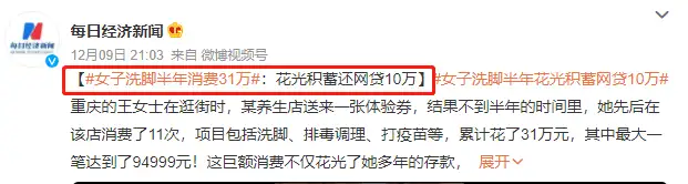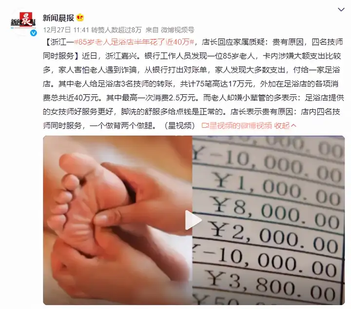 微博热搜上经常能看到女子洗脚半年消费31万、85岁老人足浴店花了近40万这样的社会新闻话题。