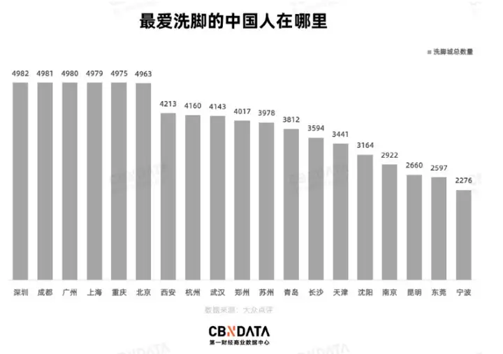 根据第一财经数据中心相关报告,在洗脚城的绝对数量上,深圳是毋庸置疑的王者。这座不夜城,以4892家洗脚城的数量排名全国第一。