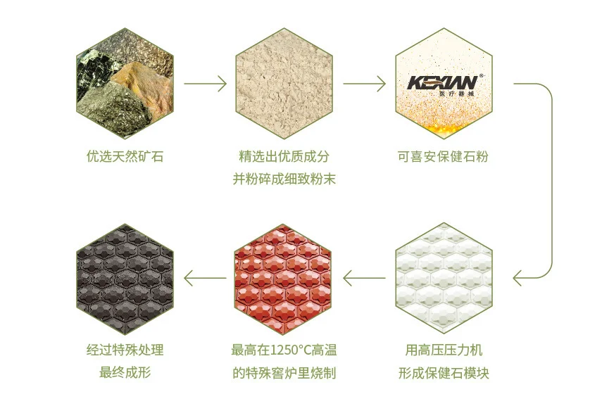 由于远红外线和负离子对人体有重要的作用,可喜安以此为契机,将麦饭石、黑云母、电气石、长石等按一定比例混合后,在高温下烧结制成可喜安保健石,再将保健石拼接制作成各种床垫、马甲、腰带等保健产品,从而起到对人体的保健作用。
