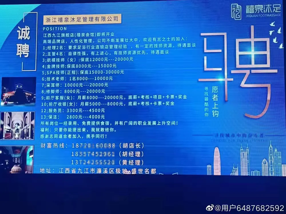 据梁先生提供的图片,该招聘公告发布方为浙江禧泉沐足管理有限公司,称江西九江旗舰店(禧泉会馆)即将开业,诚聘13个岗位工作人员,其中包括航模技师(女)金牌技师SPA技师(正规)等。
