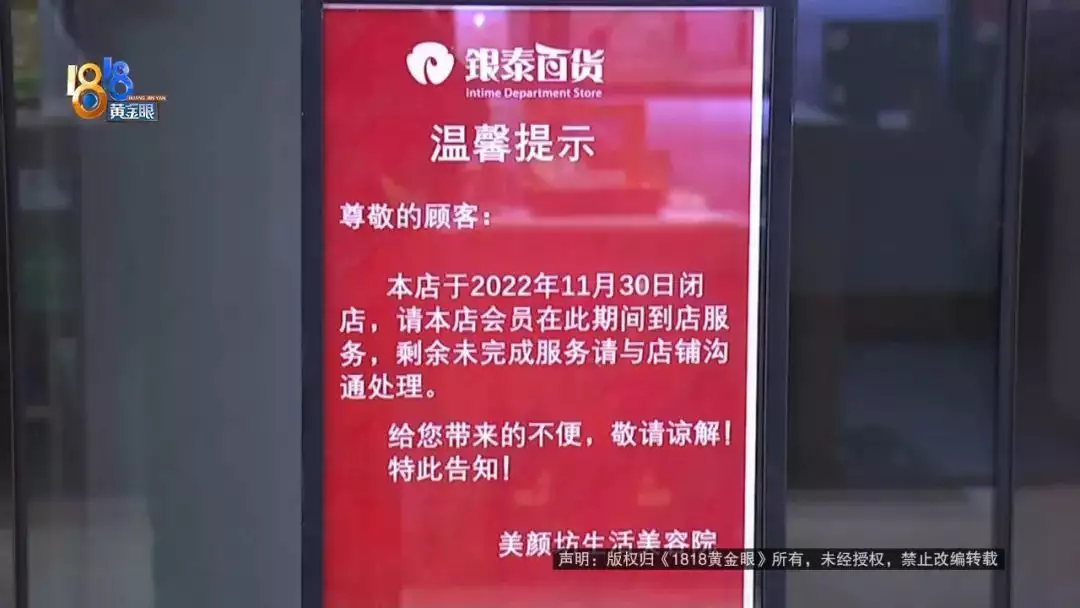 这家店的招牌被拆了一部分,门口有银泰百货的提示,说本店于2022年11月30号闭店,剩余未完成服务请与店铺沟通处理,下方落款是美颜坊生活美容院。