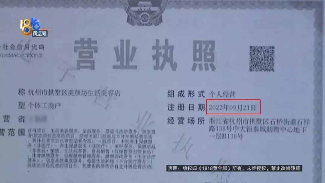 店内有个空货架,墙上贴着营业执照,工商注册名叫杭州市拱墅区美颜坊生活美容店,注册日期是今年9月份,电话联系上相关负责人。对方表示,他们是9月份接手的这家店,用了老招牌,继续服务之前的客户。