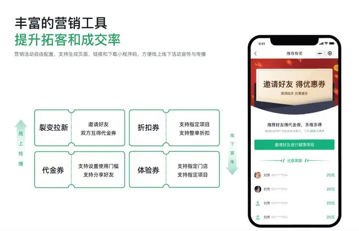 值得一提的是,在简客汇的小程序中,自带了丰富的营销工具,比如线上的有拉新裂变的邀请好友的代金券,线下有制定项目的折扣券、体验券等等,种类非常丰富,并且有了这套系统就不需要自己去策划活动,顾客通过小程序自动获得优惠券线下体验,一气呵成。