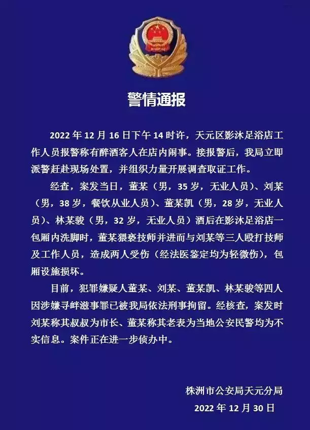 12月30日凌晨,株洲天元区公安分局发布警情通报称,12月16 日下午 14 时许,天元区影沐足浴店工作人员报警称有醉酒客人在店内闹事。接报警后,分局立即派警赶赴现场处置,并组织力量开展调查取证工作。