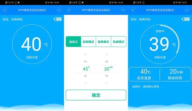 通过和手机搭配使用,用户可以实时掌握HITH智能无线足浴器Q2的各种状态,包括待机模式、电池电量、泡脚时间和实时水温。操作界面设计比较简单,整个操作也比较简单。手机可以实时对其进行各项操作,比单机模式要方便许多。