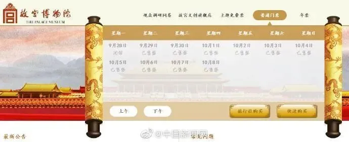 登录故宫博物院官网可以发现,目前故宫10月1日-10月8日的门票已经全部售罄。敦煌莫高窟10月1日至10月8日的A类票也已经售罄。