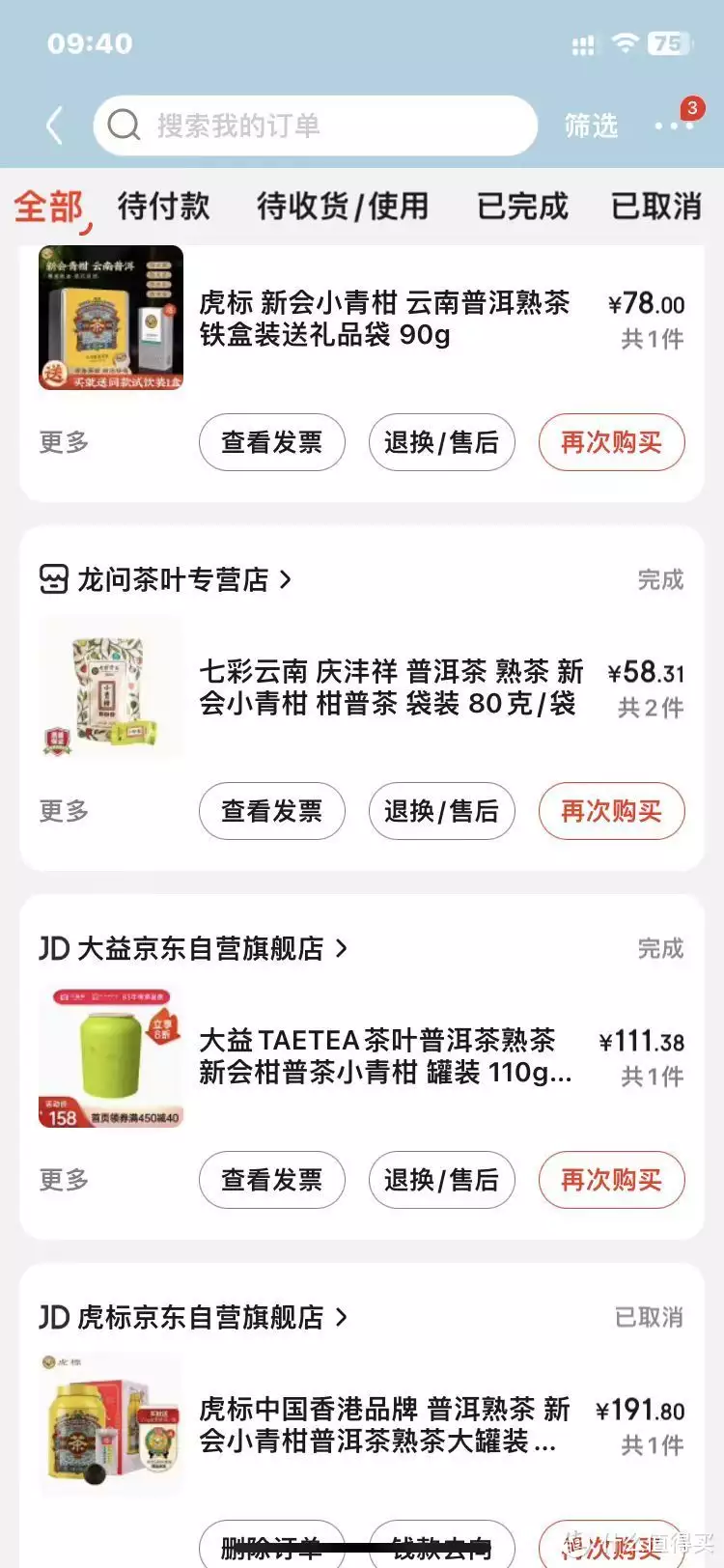 这次新买的有中茶、大益是冲着牌子去的,没有买最贵的款,就是想喝着解渴就行,虎标和七彩云南是看着销量买的,这两款销量很高。
