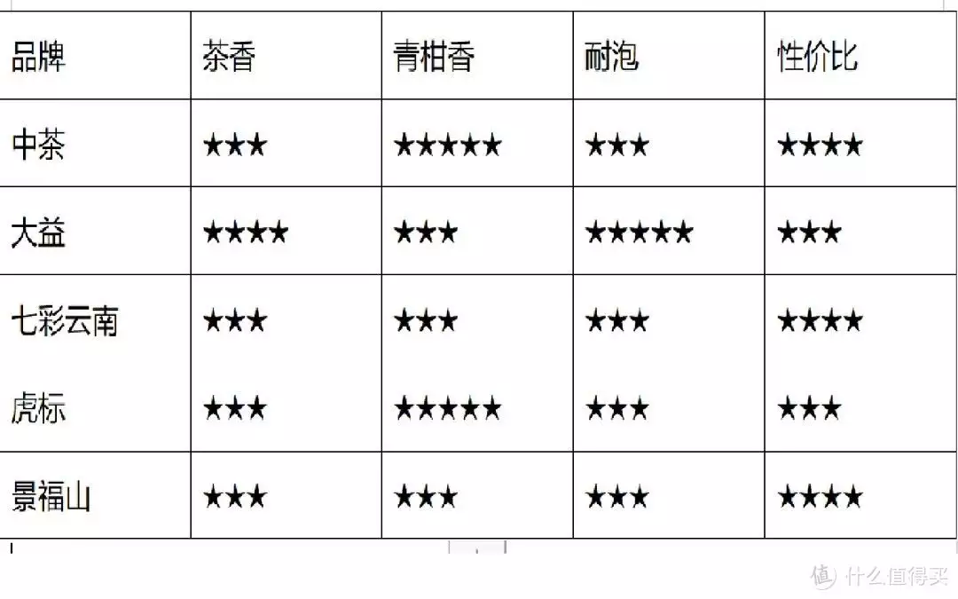 香气上中茶和虎标感觉最好,都有柑橘的清香在嘴里回味,七彩云南太淡了,感觉泡900ML的水要2颗才行,大益的茶味很浓,柑橘味稍弱,但是也不错。
