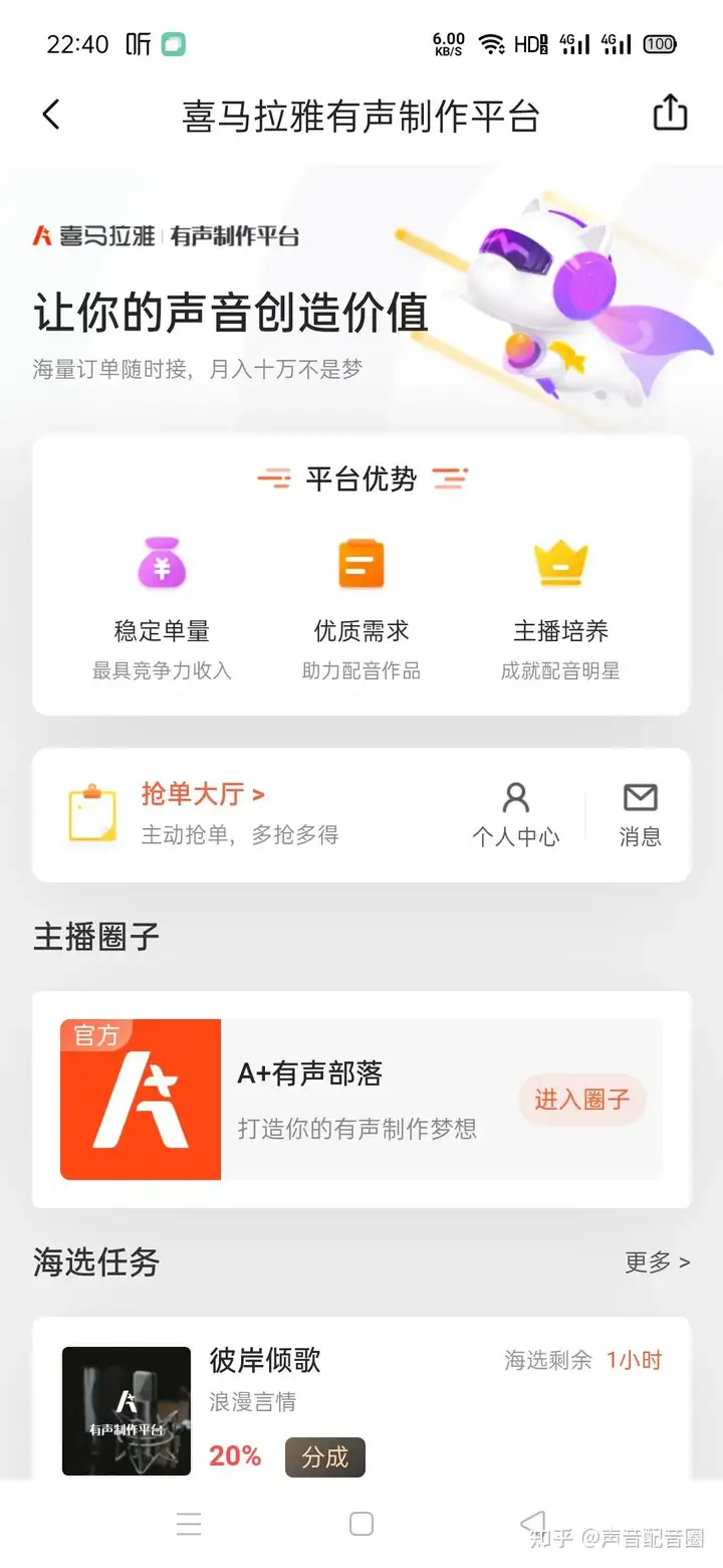 我们先来看看最出名的某拉雅平台,据我看到的博主分享,在这个平台注册成功之后,可以去试音,试音成功的话最高是200元/小时,我当时天真地相信兴致勃勃地去注册了一个号想着我要发财了,结果注册之后发现,诶确实是200元/小时,但是跟你竞争的有成百上千的人,包括业余的、专业的配音演员,还有一些像我这样闻风而来的愣头青,什么基础都没有也没有天分出来没接触过配音的,这一看怎么跟人家竞争?我连个声卡都没有,更别提专业设备了,开局一张嘴,装备全靠吹