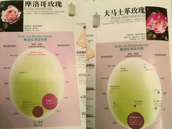 大马士革玫瑰产自保加利亚和土耳其,摩洛哥玫瑰产自摩洛哥,都是玫瑰精油,产地不同,化学成分差别很大,大马士革玫瑰属醇类,80%的单萜醇助肝,帮助解肝毒,调整月经规律和经量,还可以抗乳腺癌和妇科癌症。而摩洛哥玫瑰中含有大量的苯乙醇,高达63%,单萜醇的含量只占30%,苯乙醇所发挥的是局部麻醉的作用,醇类所具备的作用自然很弱了。