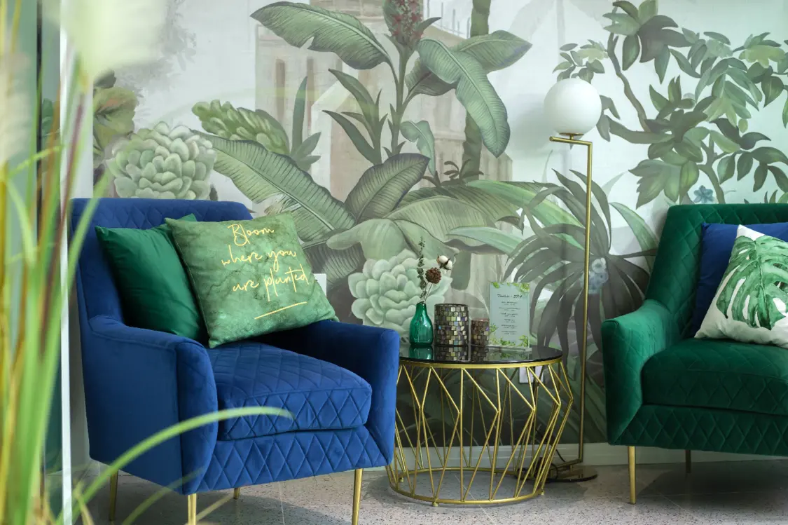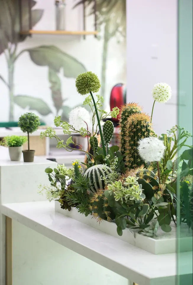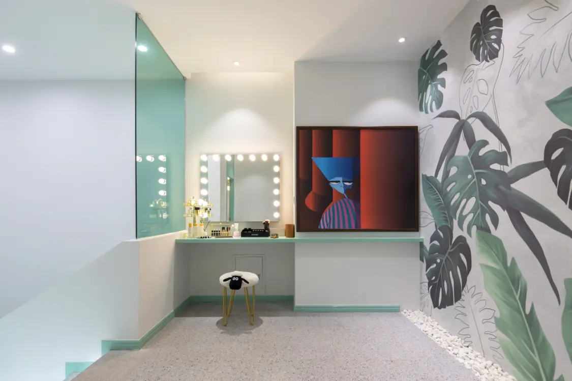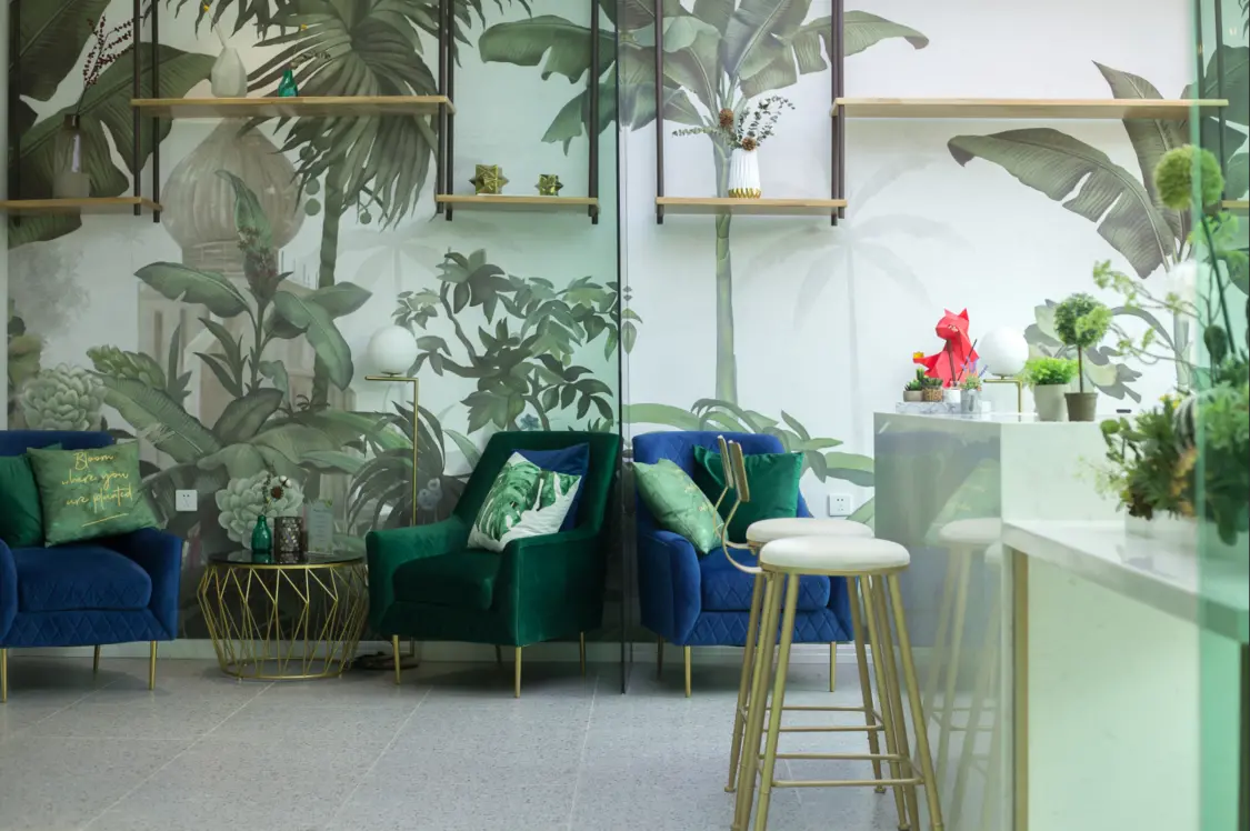 休闲区 休闲区大面积绿植壁纸与空中错落木质置物架搭配,营造出自然丛林感。窗口处绿植巧妙遮挡窗外杂物,净化视觉的同时与室外景观自然互动。设计师灵活运用玻璃进行功能分区,保证空间内视觉流畅的同时,还给室内提供了充足的自然光线。