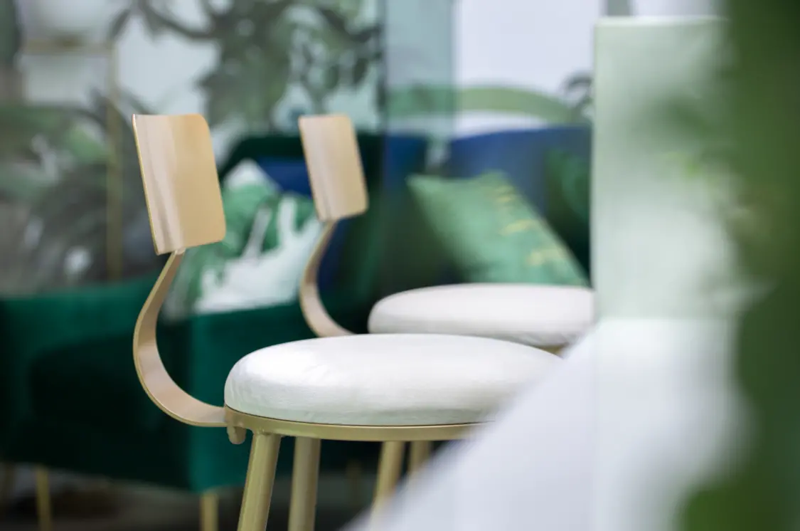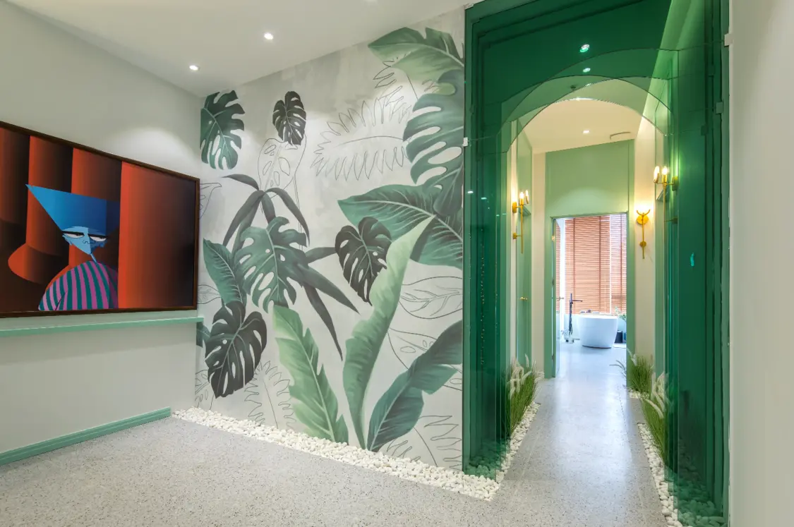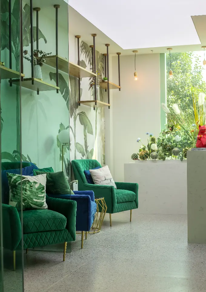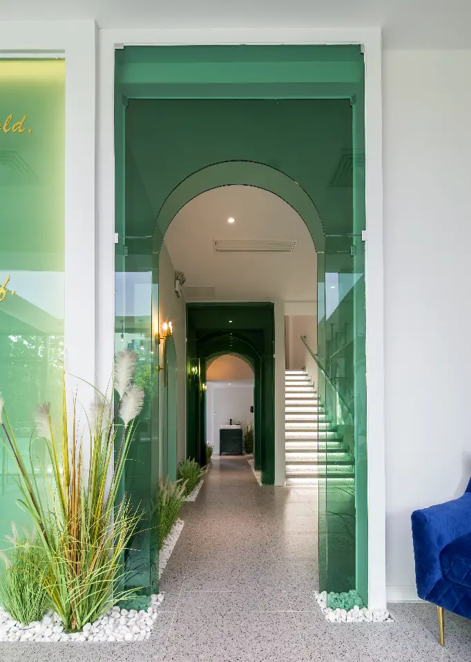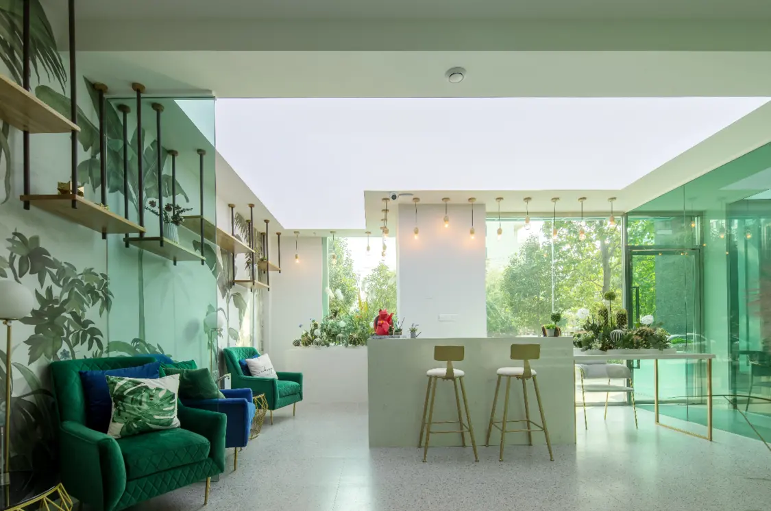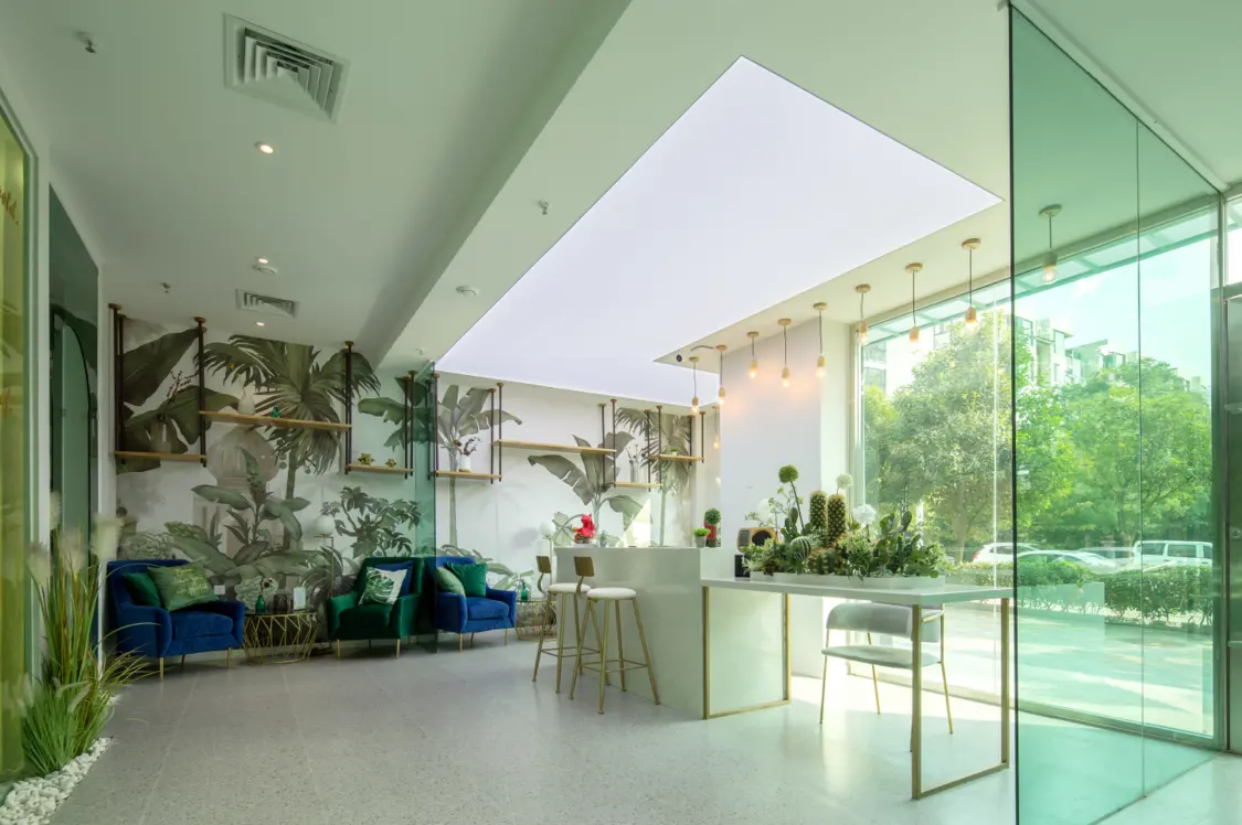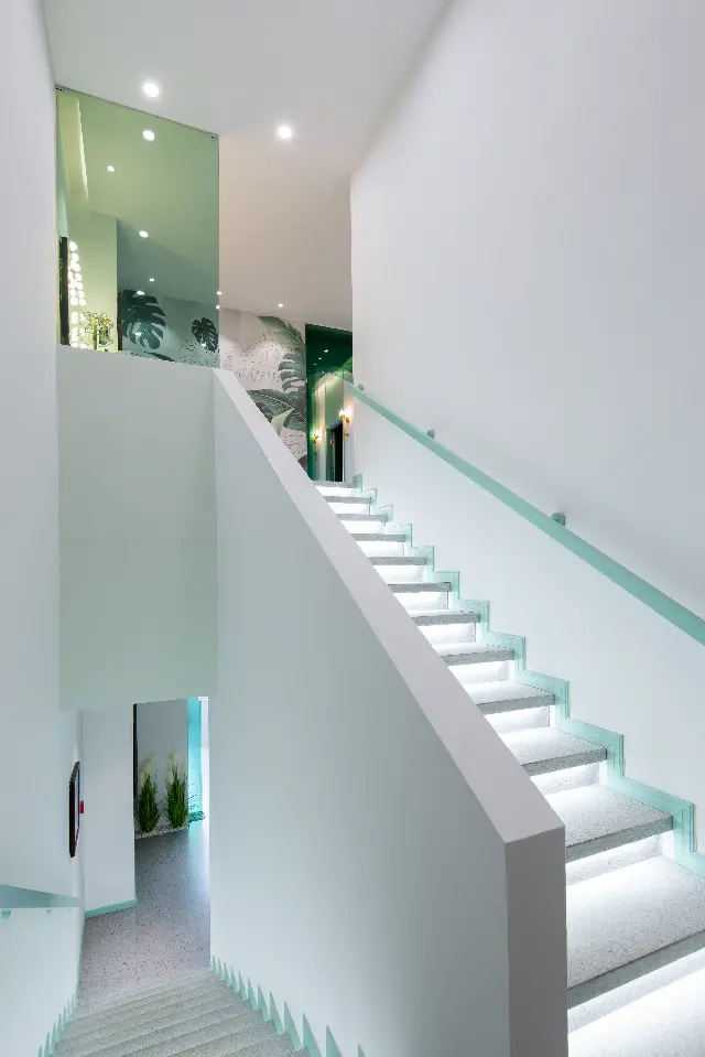 内外 绿色主调一路引导,配以简约流畅的线条,营造明澈、通透、优雅的整体空间气质。设计师采用室内外发光膜结合使用,在更好的为室内绿植打光的同时,使室内外形成延伸感。门廊彩色玻璃错落层叠,搭配光的出现,轻盈、朦胧而富有层次。