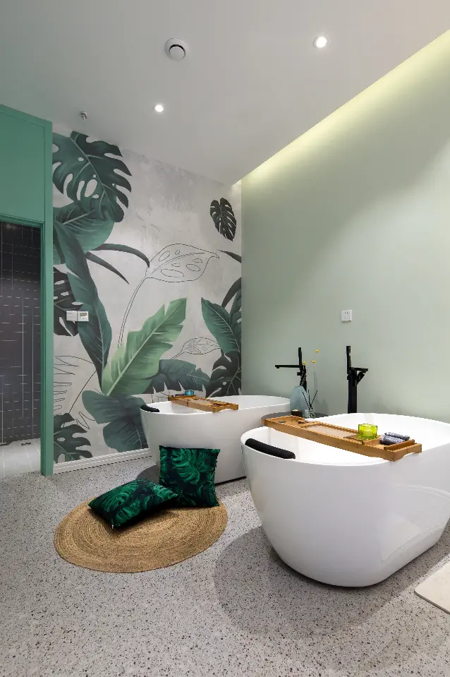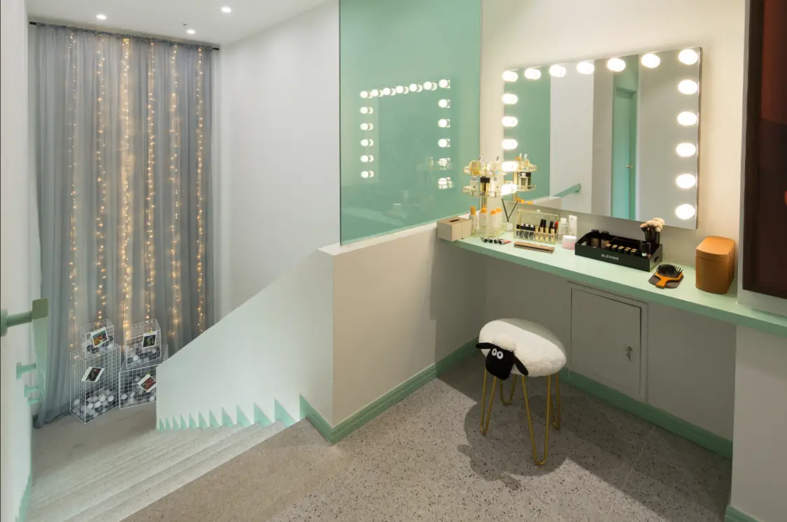 房间 房间内隐藏着质感的碰撞与细节的惊喜。单人房内玻璃、金属、木材,不同材质混搭,形成视觉上的轻微跳跃,又融入整体。墙面凹凸造型与绿植壁纸,令墙面更有细节,避免视觉上的沉闷。星空房采用全面星空灯光处理,配以点点烛光,轻易便可沉浸。