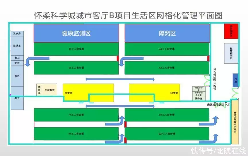 北京城建集团、城市客厅B地块项目经理李逢军介绍说:宿舍区设置了两栋楼分别作为健康监测和隔离室,共90间房,如果有出现身体不舒服的,第一时间把有症状的放到隔离区,相关人员放在健康监测区,我们建立了应急处理的机制,包括排查、隔离、自己的流调,减少减员造成的损失。