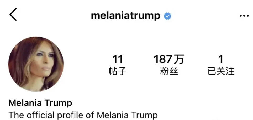 梅拉尼娅偶尔会想起自己还是个前第一夫人,在今年1月新开了ins,目前有187万粉丝,但快一年了,只发了11个帖子。
