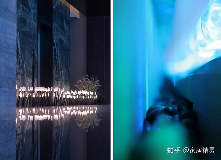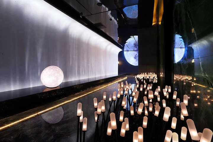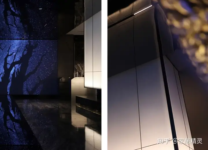 项目位于建筑的裙楼的二楼,乘电梯上来出电梯展现出来的一幅动态的唯美图景,将电梯厅变成一副梦幻的时光隧道,通道的尽头嵌入大幅的LE屏幕,不断变化的场景仿佛穿越星际。