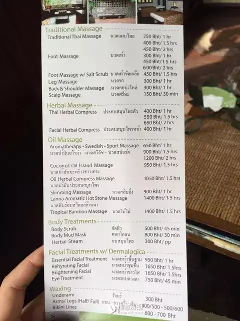日常价格表。传统泰式按摩250泰铢是街边小店价格,足部按摩300泰铢比路边价贵50泰铢。重点推荐她们家的油按草药包oil herbal compress,真的很舒服!