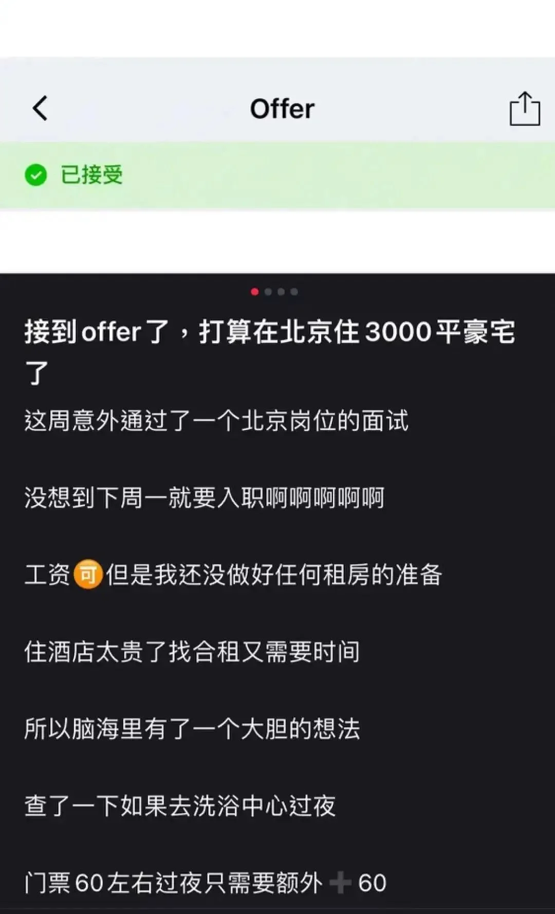2月26日,小李接到北京某快消品公司运营岗位offer后,立即坐高铁从广州来到北京,当天晚上就直接住进了洗浴中心。