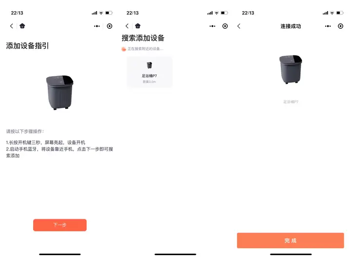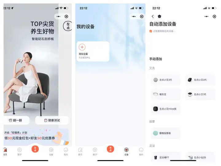 左点小仙足浴桶P7,还是一款可以通过蓝牙连接到手机的足浴桶,通过微信小程序“左点健康”,就可以搜索这款产品进行连接。