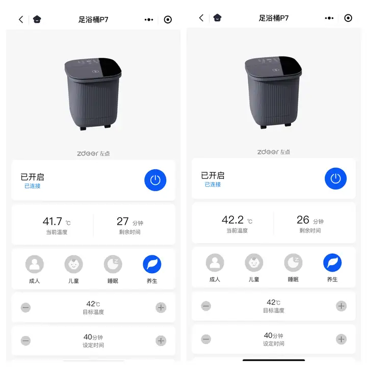 当然,每种模式不是一直加热,而是有一个默认的最佳温度,38~45摄氏度之间,这个温度区间绝对是让人泡到忘我的一种状态。相比普通泡脚桶无法让温度保持在一个适宜的区间,左点小仙足浴桶P7小于2度的温差,泡个半小时,确实能赶走一天的疲惫。