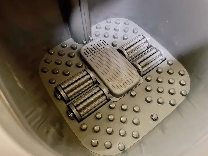 再看看它的内部,两排4个滚动滑轮和周围密密麻麻的仿鹅卵石指压板,踩在上面那叫一个酸爽,10度的倾斜角度,恰到好处的贴合足部曲线。