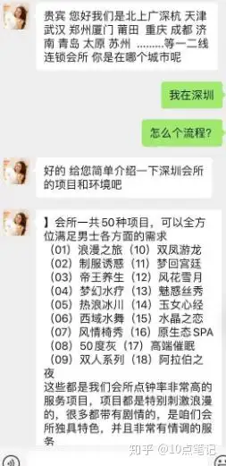 客服问清楚王所在的地址之后,马上发来了深圳会所能提供的50个项目。什么双凤游龙、帝王养生、玉女心经,王这个老司机一看就心领神会。因为根据他的经验,每一项特殊服务都会有一个诗意的名字。对方很真诚的介绍了会所的环境和流程,并发来了图片,王血脉喷张,赶紧问了具体地址。