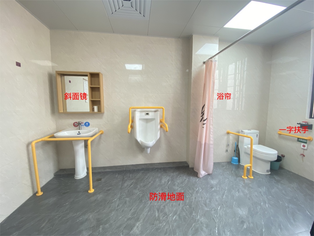 一字型扶手、l型扶手、斜面镜(方便轮椅老人),防滑地面等。
