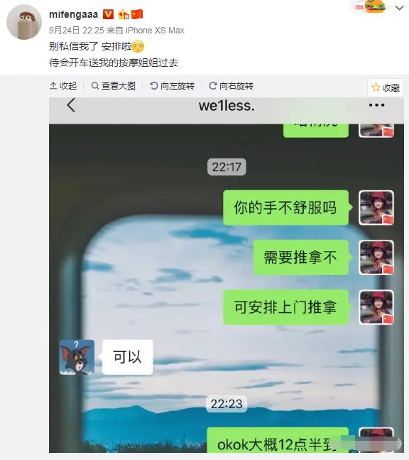 最近在直播当中,粉丝发现韦神的表现有点奇怪,于是很多人都去找他的女友蜜蜂,蜜蜂平常也是在照顾着韦神,看到这种情况就带着按摩师傅上门,问韦神需不需要,韦神说可以,然后半夜的时候蜜蜂还要带着按摩的姐姐去给他按摩,结果姐姐说太晚了,换上一个男的。