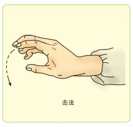 操作方法:五指并拢且微屈,以前臂带动腕关节自由屈伸,指先落,腕后落;腕先抬,指后抬,虚掌拍打体表。