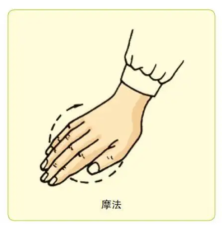 操作方法:以掌面或食、中、环、小指指面附着于施术部位,以腕关节连同前臂,做顺时针或逆时针环形移动摩擦。