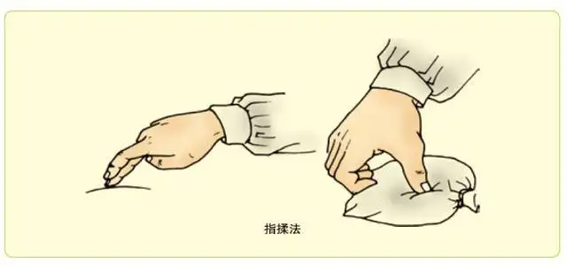 操作方法:①三指捏法:两手腕关节略背伸,拇指横抵于皮肤,食、中两指置于拇指前方的皮肤处,以三指捏拿皮肤,两手边捏边交替前进。②二指捏法:两手腕关节略尺偏,食指中节桡侧横抵于皮肤,拇指置于食指前方的皮肤处,以拇指、食指捏拿皮肤,边捏边交替前进。