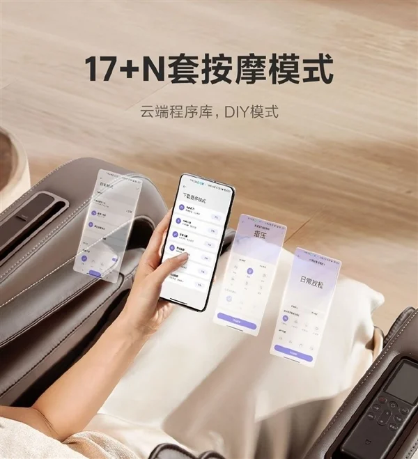 据介绍,新款智能椅支持17+N套按摩模式,其中包括出厂设备端预置4套,App精选5套、云端模式6套以及自编模式3套。除了固有模式外,用户还可以通过米家App进行云端模式下载体验以及个性化DIY。