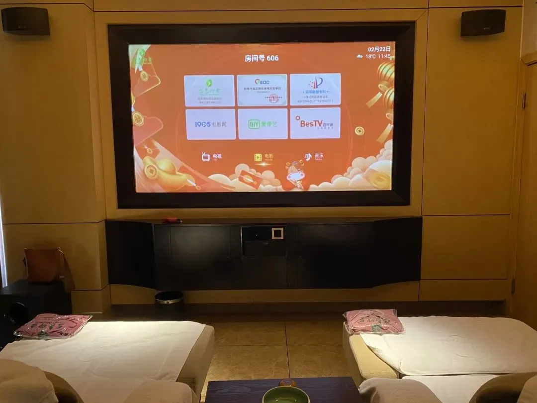 洗脚城里最基础房型的配置,都约等于一家私人电影院:荧幕、电影、躺椅、爆米花、饮品,配置齐全。