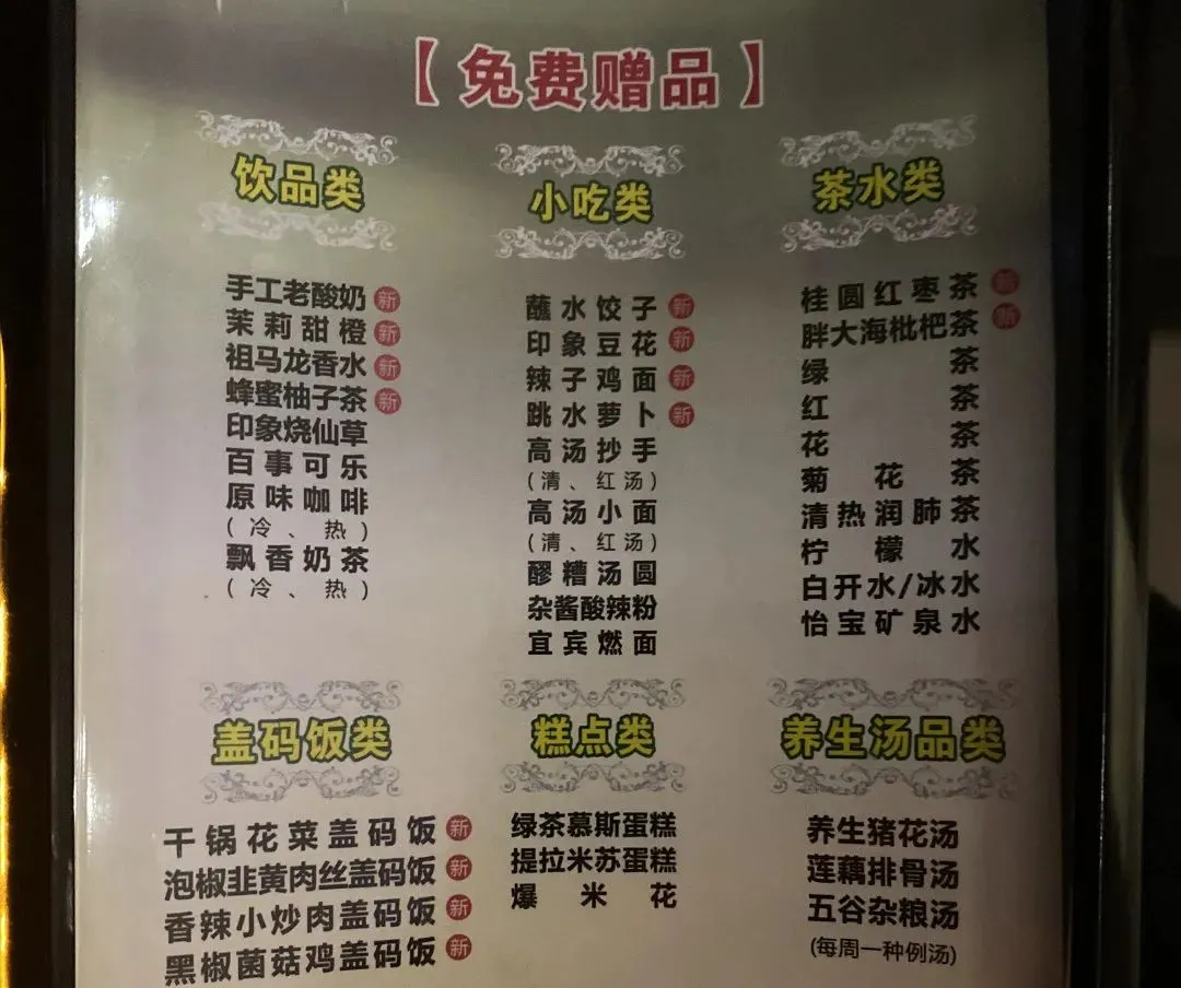 洗脚城的菜单有好丰富呢?一张单子上饭面小吃20种,饮品也有近20种,而且全部!免费!无限!敞吃!