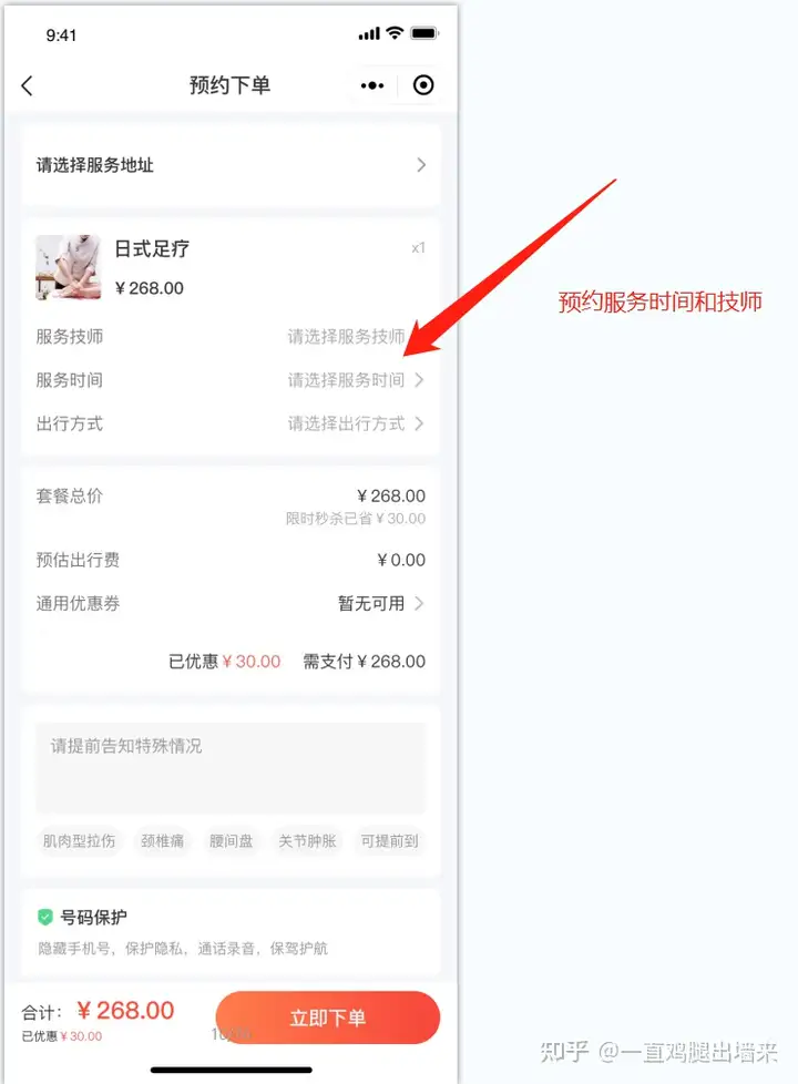 但是去店里的话不确定是不是立马就能享受到服务,说不定还要等到半个小时甚至更多时间,这时候使用我们的“技师点点”叫个上门按摩就方便的多了,可以预约时间和技师,自己来安排,到家就能享受服务,如下图: