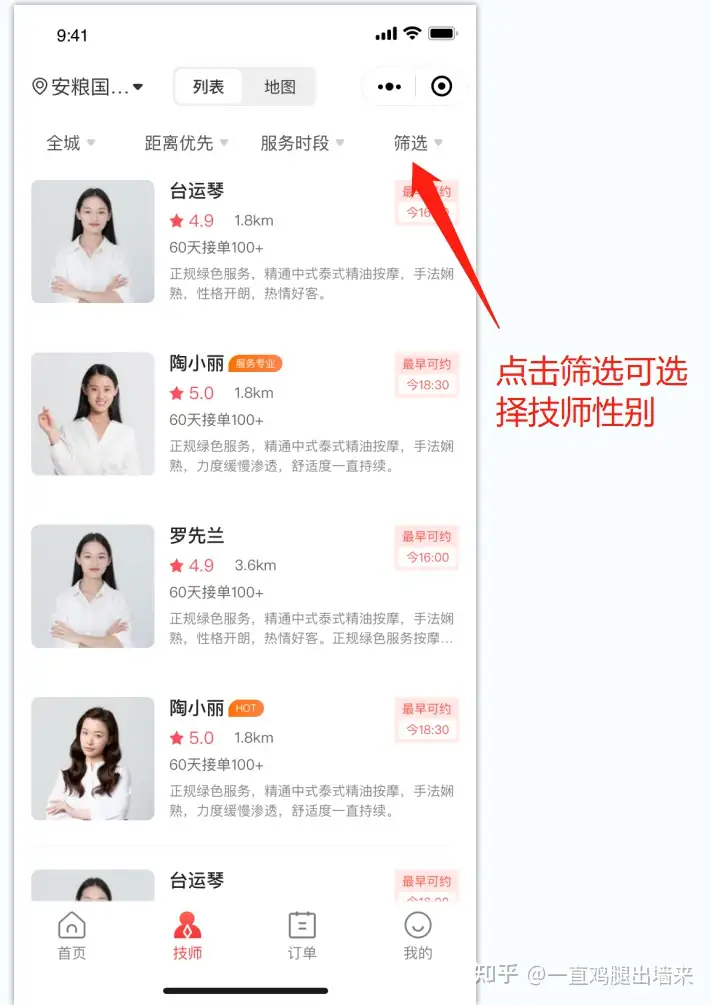 还有些人可能会有顾虑,特别是女性,可能想要女技师来服务,这样比较安全,在使用技师点点的时候,我们可以自主选择技师性别,也可以选择自己比较熟悉的技师,这还是很人性的;
