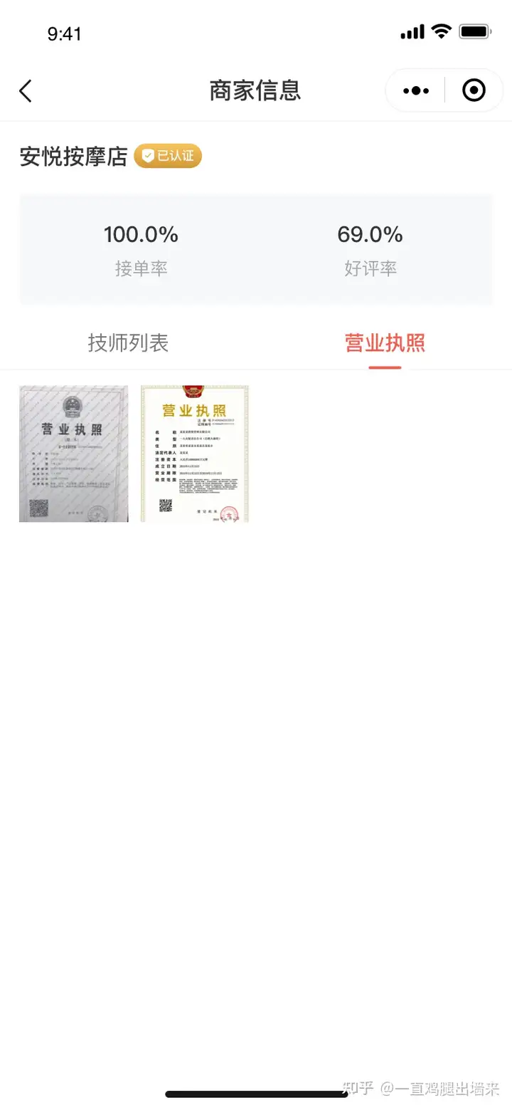 以“技师点点”为例,凡是入驻的商家都有提供营业执照,我们可以看到商家的基本信息
