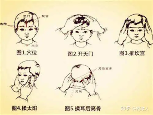 从上往下梳背或华佗夹脊10次,开天门50次,推坎宫50次,按揉太阳穴1分钟,按揉小天心1分钟,按揉神门1分钟
