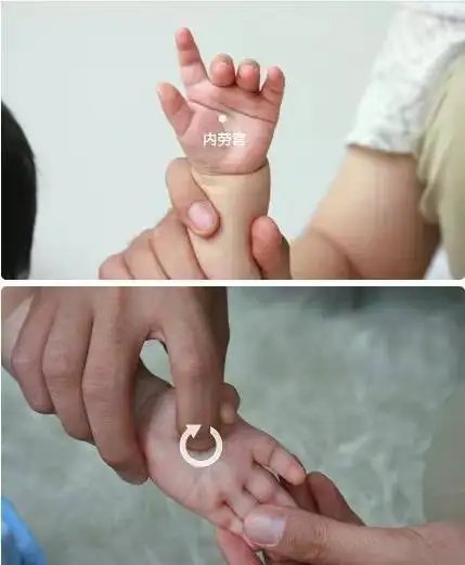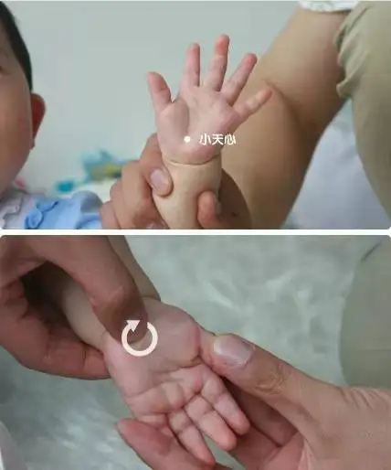 操作:两拇指自掌侧腕横纹中央(总筋穴)向两旁分推,称分推大横纹,又称分手阴阳、分阴阳。