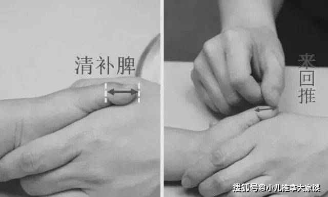 手法:清补脾即来回推之。(最好将小孩拇指微微屈曲再操作)。