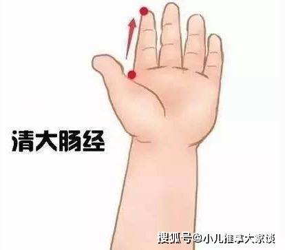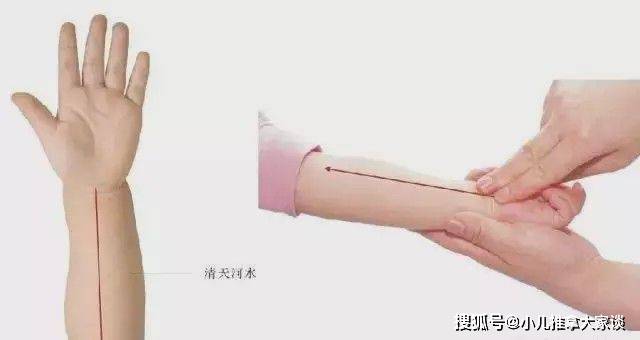 手法:用一只手握住孩子的手腕,使其掌心向上,然后用中指、食指指腹自孩子腕横纹推向肘横纹,直推200次,推的方向一定是从腕到肘,不可反向操作!