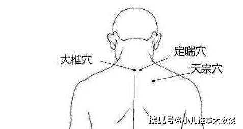 位置:位于背部大椎穴旁开0.5寸,左右各一穴。把孩子头低下,用手在颈后摸索,会在颈后摸到隆起的一块突起的硬骨,这就是第七颈椎棘突,它的下缘凹陷的地方就是大椎穴。