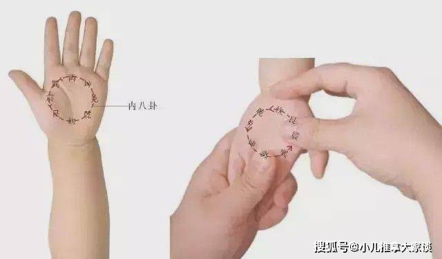 手法:使用按摩油等按摩介质,用大拇指或食、中指指尖轻轻的由乾卦起,以顺时针的方向推运至兑卦止,周而复始画圈,手法力度一定要轻。