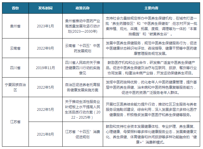 我国各省市也积极响应国家政策规划,对各省市养生保健行业的发展做出了具体规划,支持当地养生保健行业稳定发展,比如云南省发布的《云南省“十四五”中医药发展规划》提出发展中医养生保健服务,规范中医养生保健服务行为,促进中医健康状态辨识与评估、咨询指导、健康干预等中医药健康管理服务规范发展。