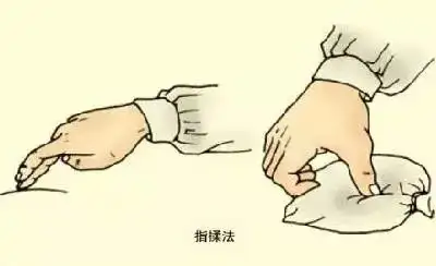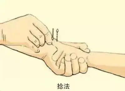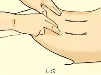 ①三指捏法:两手腕关节略背伸,拇指横抵于皮肤,食、中两指置于拇指前方的皮肤处,以三指捏拿皮肤,两手边捏边交替前进。
