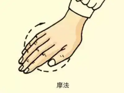 操作方法:以掌面或食、中、环、小指指面附着于施术部位,以腕关节连同前臂,做顺时针或逆时针环形移动摩擦。
