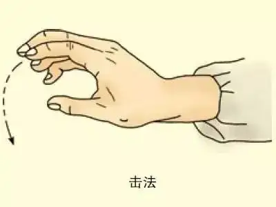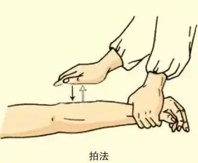 操作方法:五指并拢且微屈,以前臂带动腕关节自由屈伸,指先落,腕后落;腕先抬,指后抬,虚掌拍打体表。
