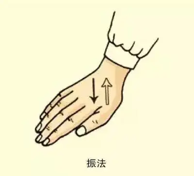 ①掌振法:以掌置于一定部位,做连续、快速、上下颤动,用于腹、腰部。