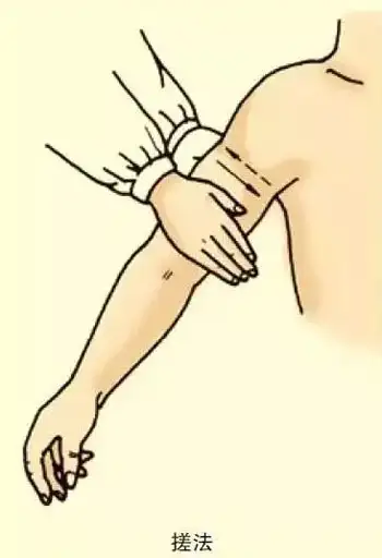 操作方法:两手夹住肢体相对用力,做相反方向的快速搓动,同时上下往返移动,用于上肢部。